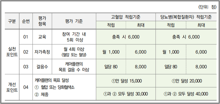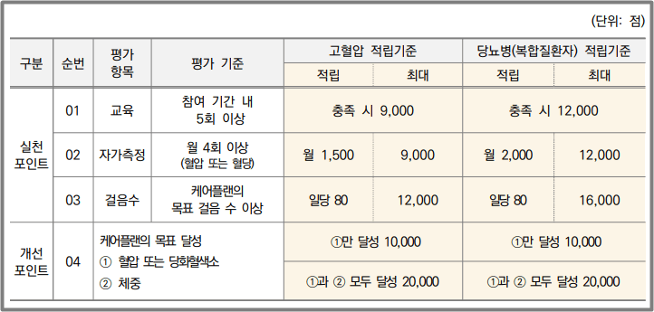 - (당뇨병, 복합) 실천포인트 연간 최대 2만점, 개선포인트 연간 최대 4만점 적립